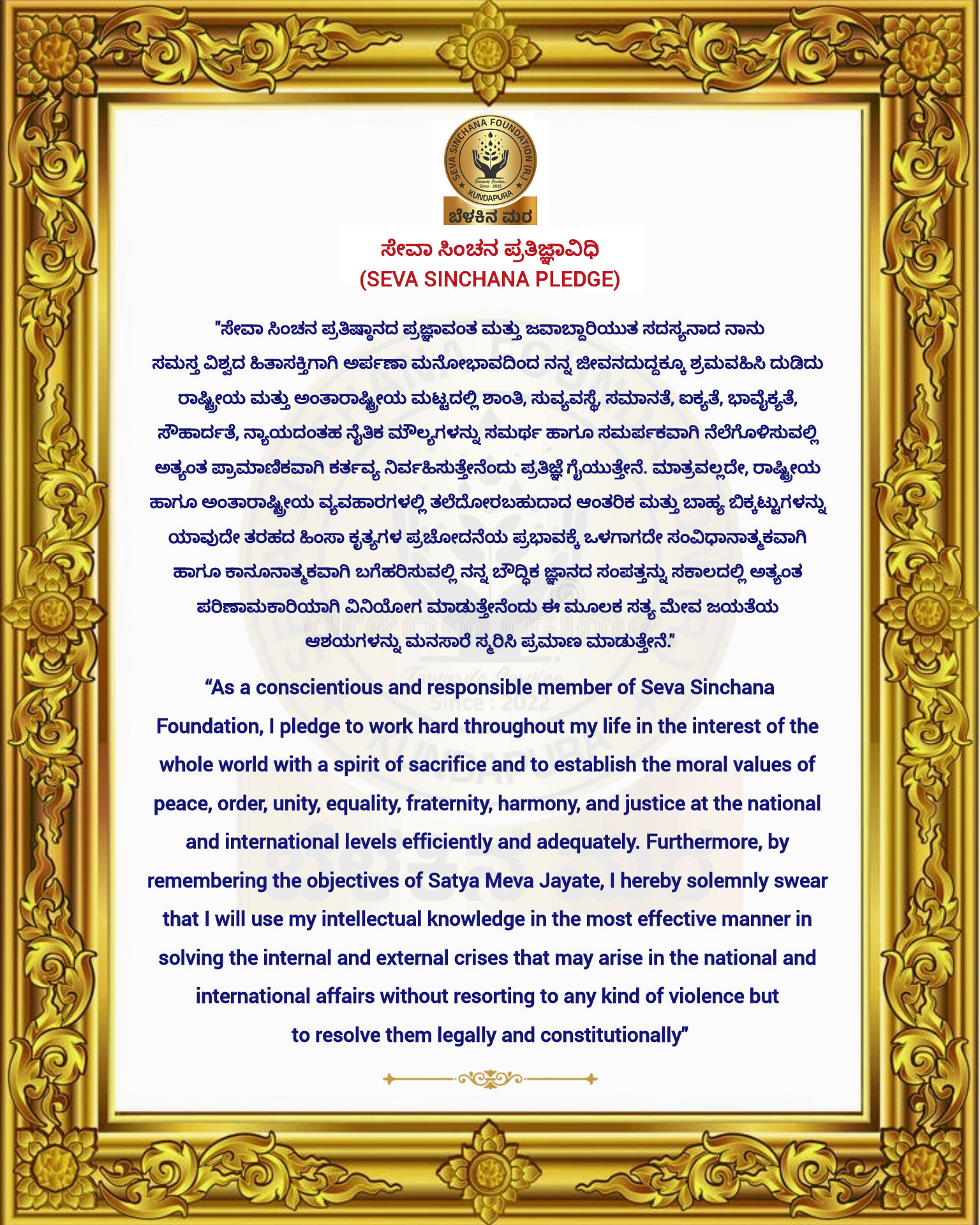 We, the members of Seva Sinchana Foundation, pledge ourselves to the service of society with unwavering faith and integrity.